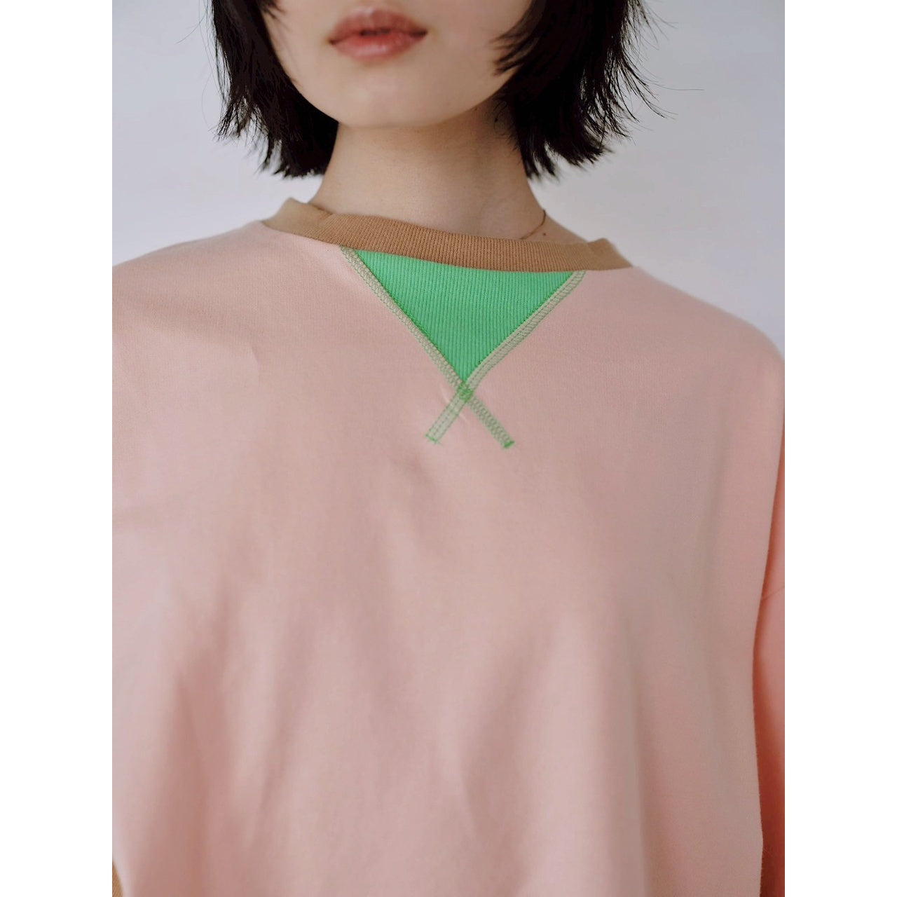 輕薄衛衣質感的T恤,領口、V形三角與兩側皆為撞色拼接。