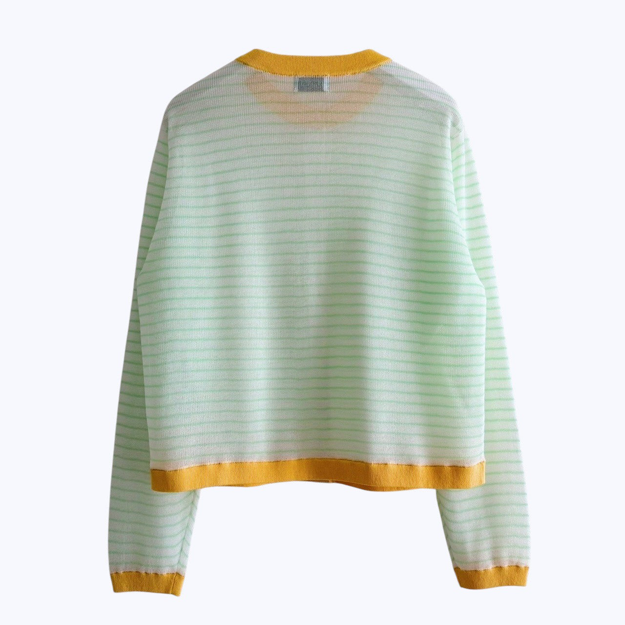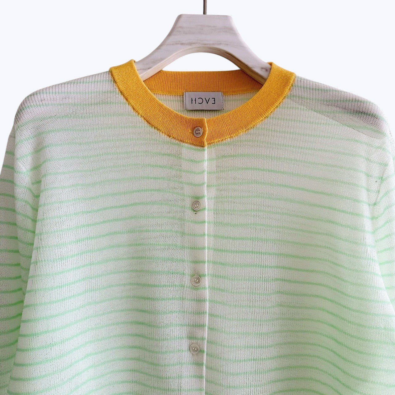 A striped cardigan knitted with high-twist yarn, offering subtle sheerness. Finished with contrasting trims at the collar, cuffs, and hem.