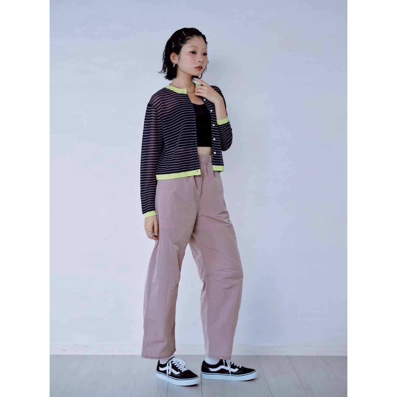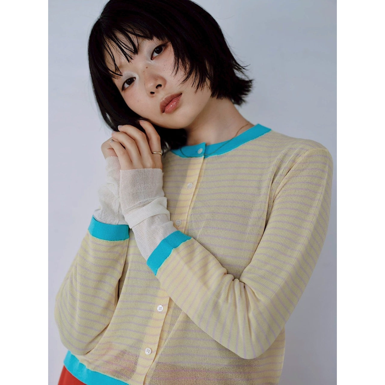 以高捻紗編織而成的條紋開襟衫,帶有適度透感。領口、袖口與下擺採用撞色設計,增添亮點。