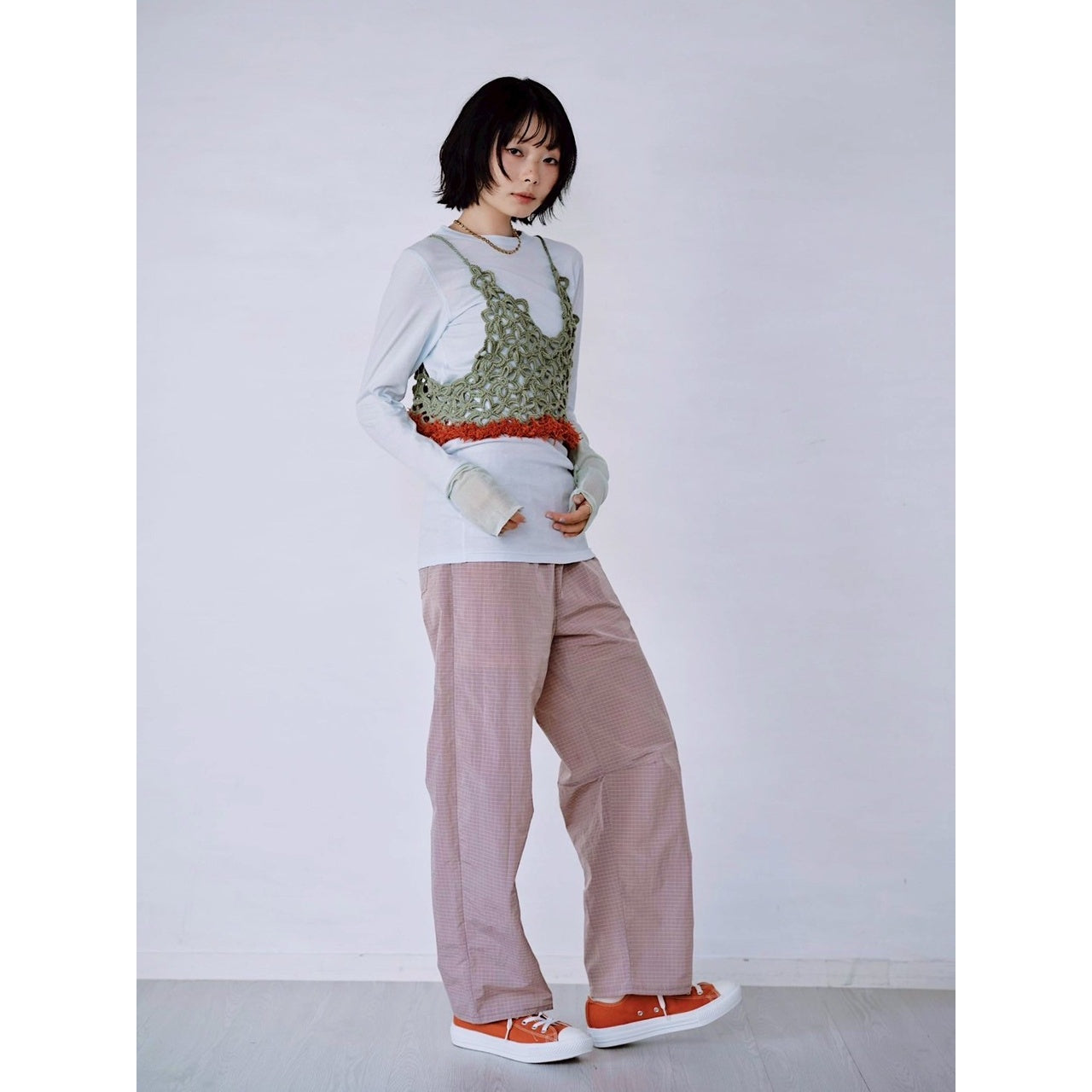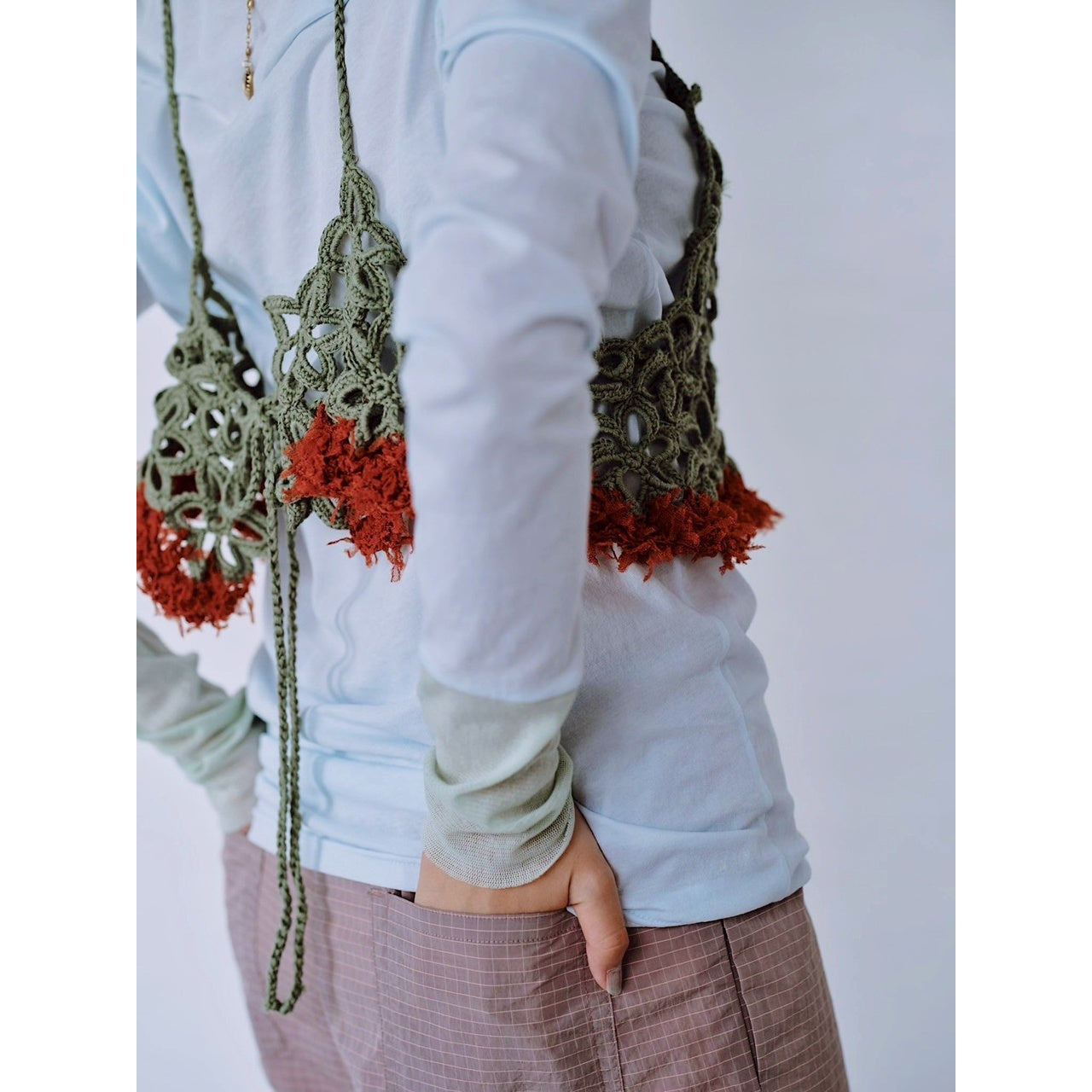 鉤針編織的吊帶背心,下擺加入特殊紗線點綴,增添層次感。