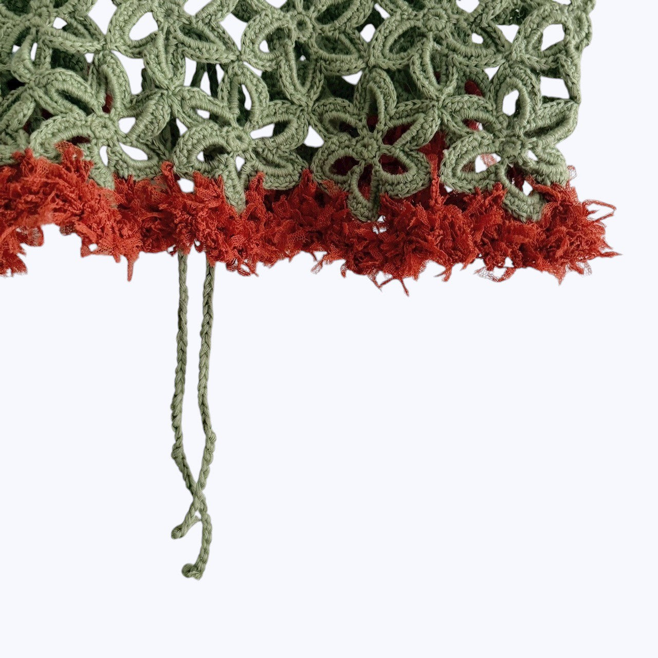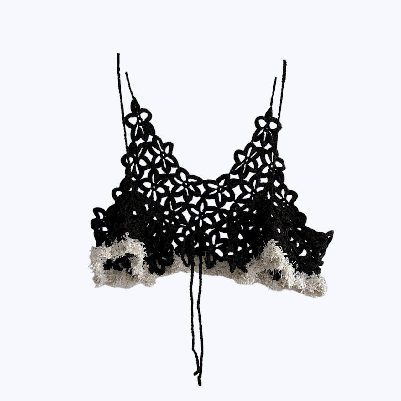 A crochet bustier finished with fancy yarn details at the hem. Perfect for layering over simple tops.