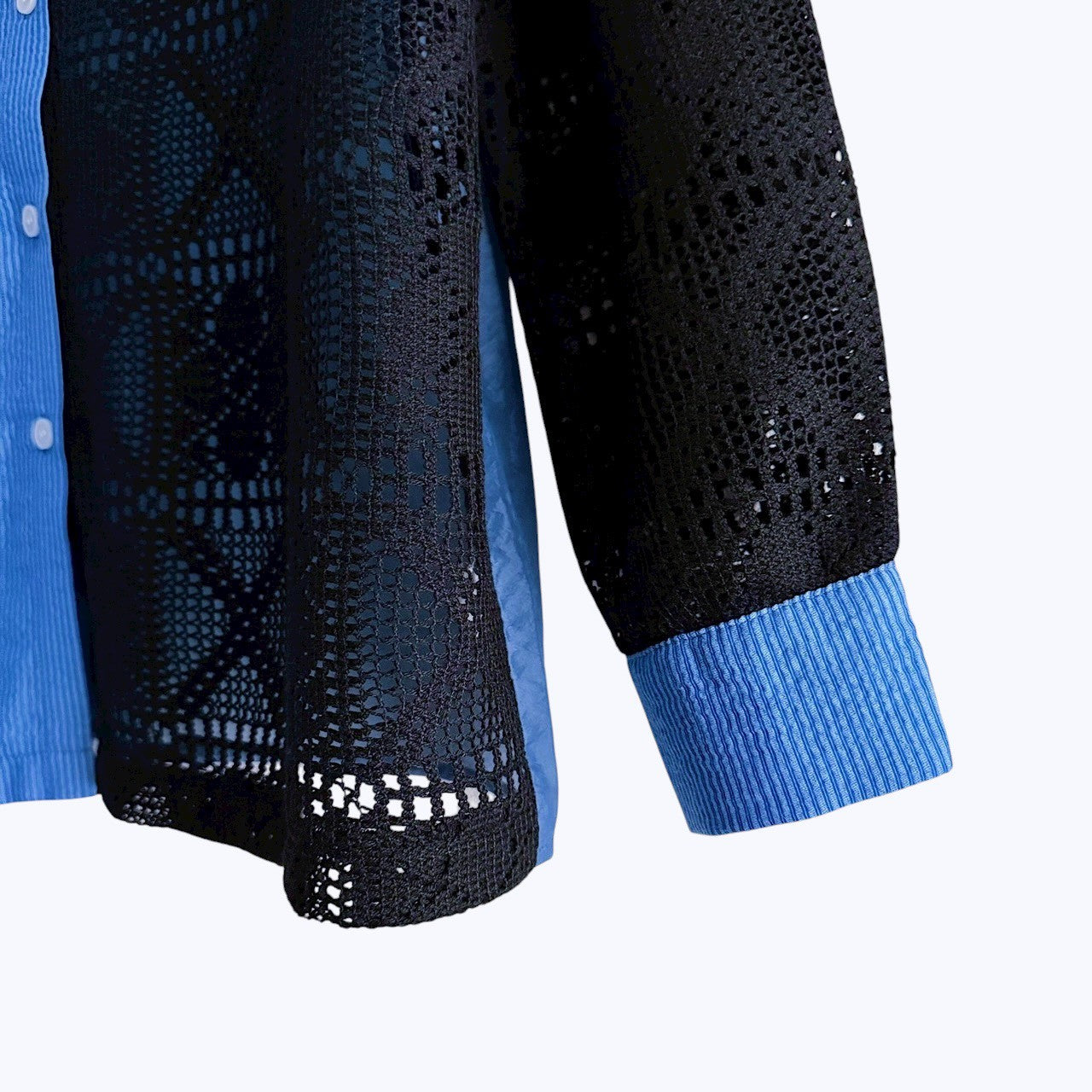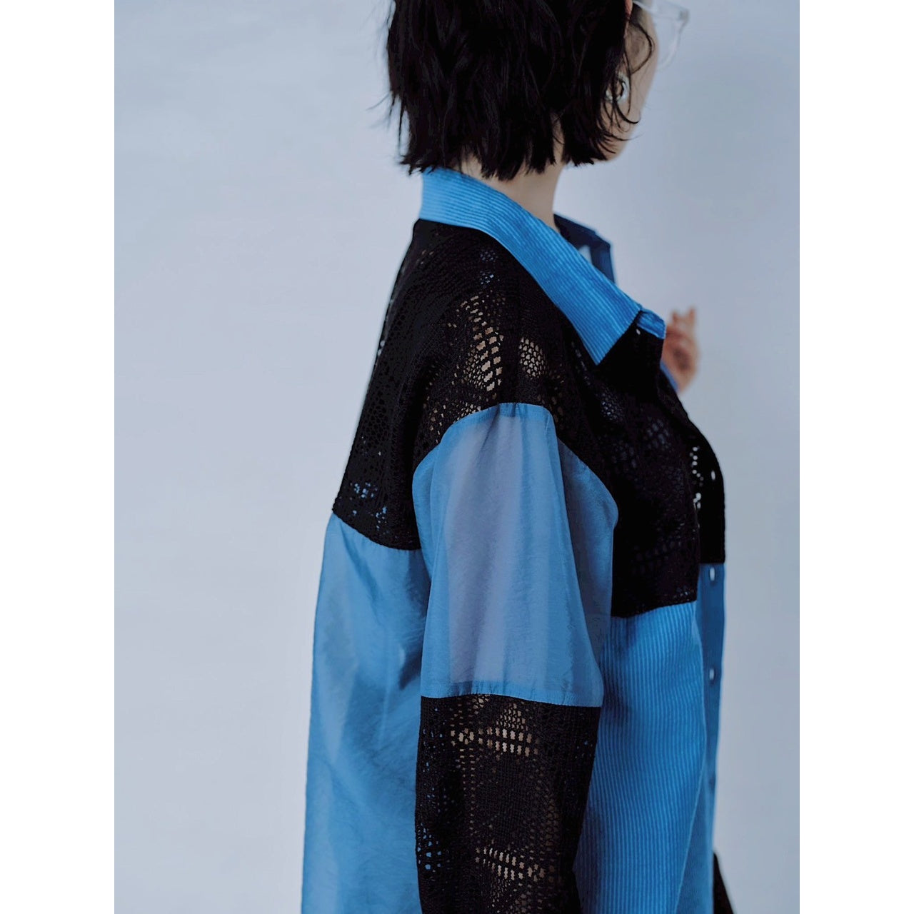 A shirt combining lace, sheer fabric, and striped fabric. The delicate lace panels contrast beautifully with the other materials, creating layering versatility.