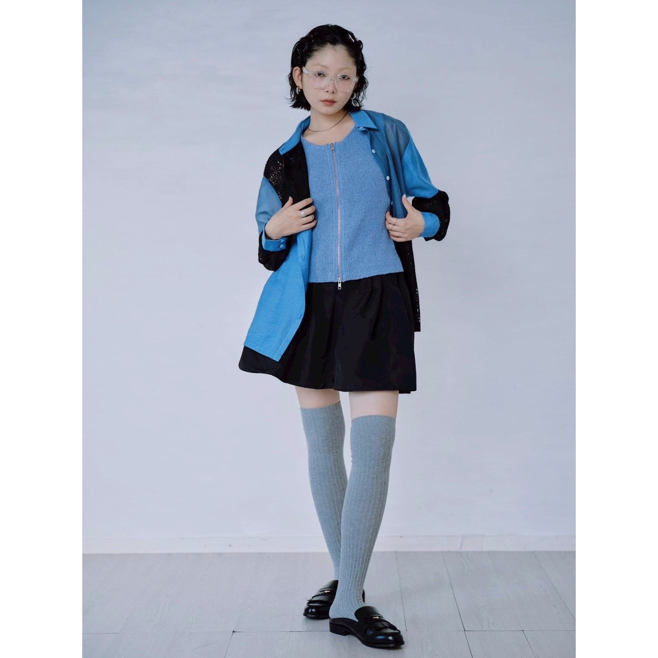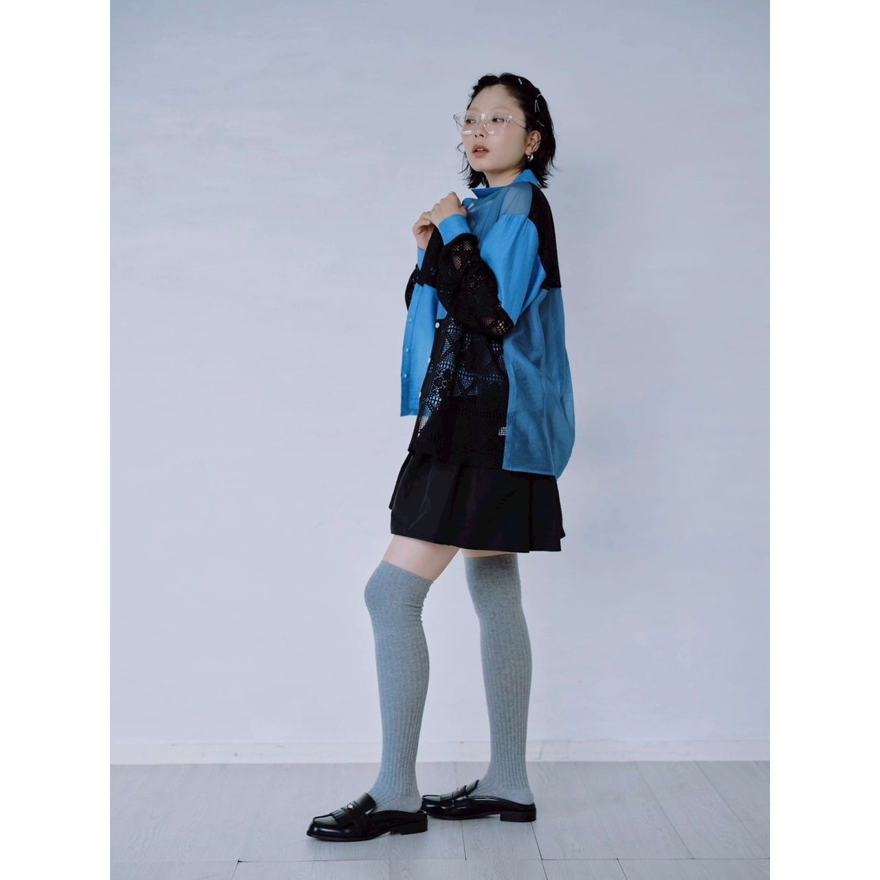 以蕾絲、素色透膚面料與條紋面料拼接而成的襯衫。精緻的蕾絲拼接與異材質對比,展現層次感與優雅氣息。