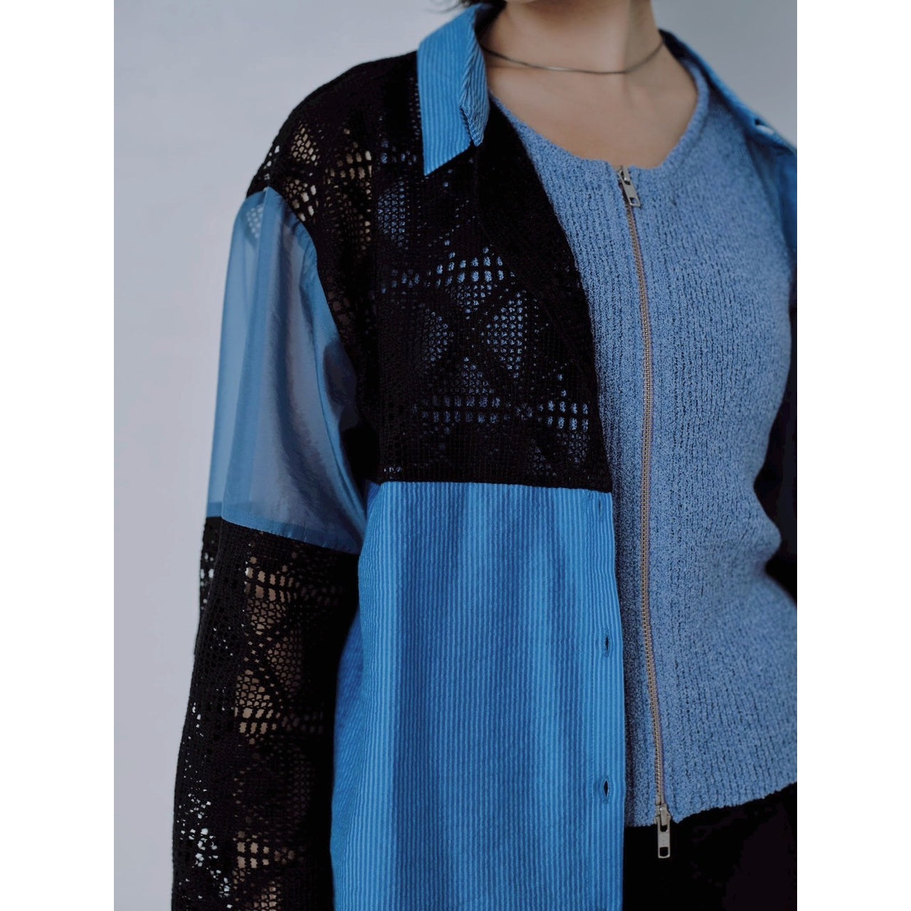 レース生地、無地のシアー生地、ストライプ生地を組み合わせたシャツ。