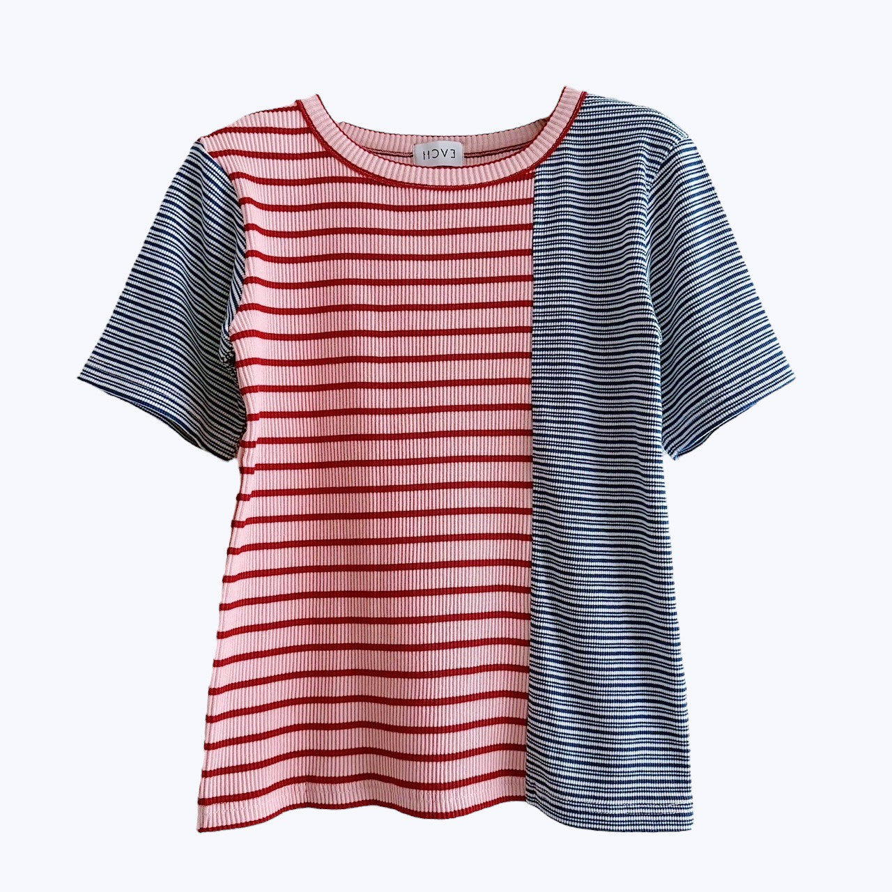 A ribbed T-shirt combining different stripe patterns for a playful, graphic look.